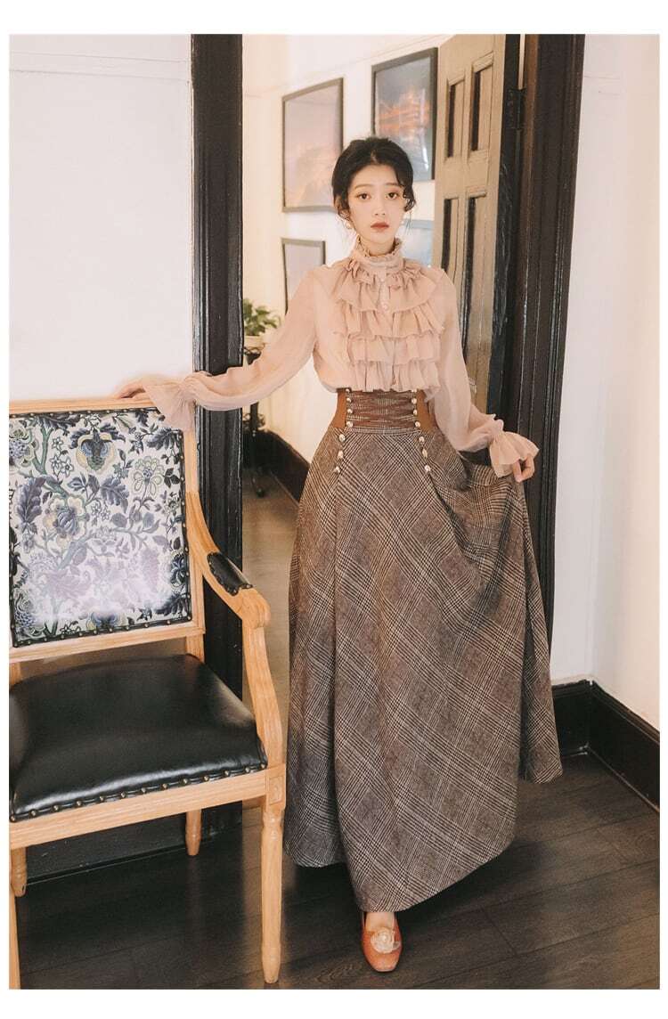 【在庫限り】ヴィンテージランタン袖フリルブラウス+チェックハイウエストスカートセット