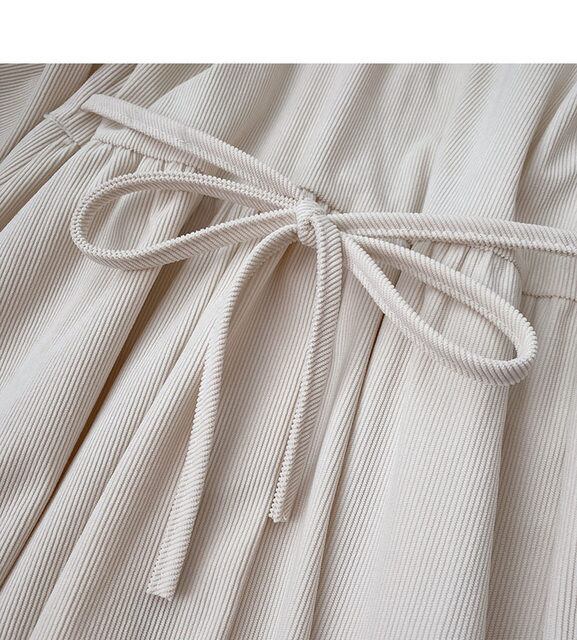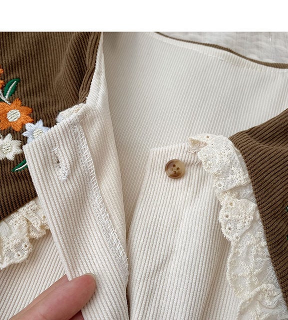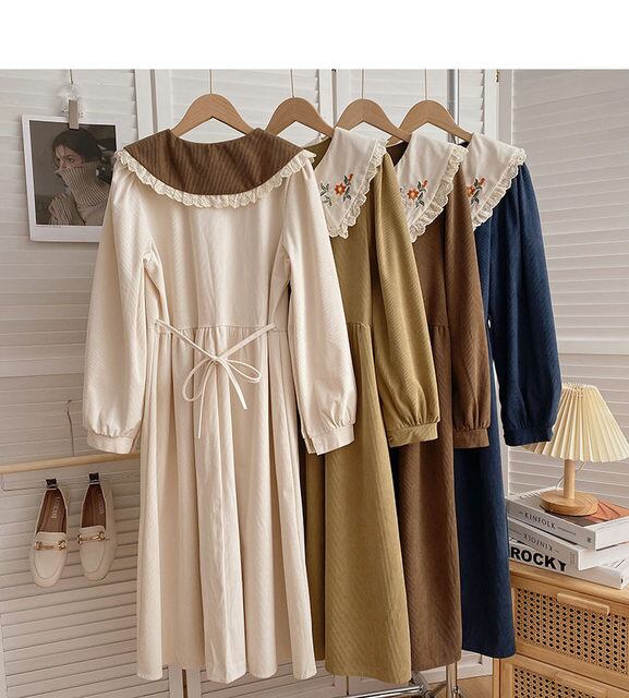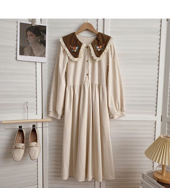 花柄刺繍襟ナチュラルコーデュロイワンピース